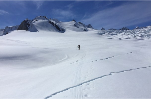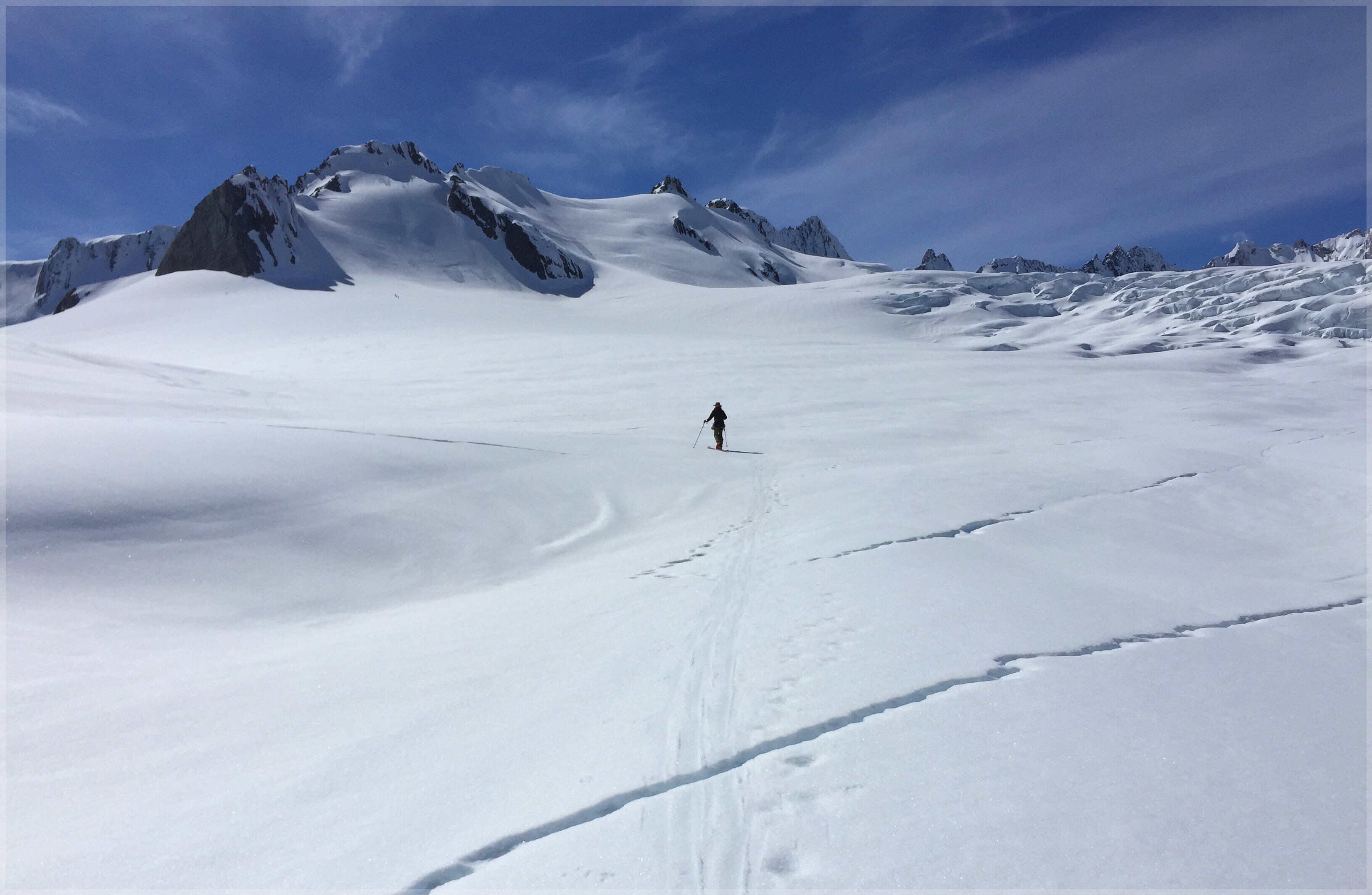I didn’t notice the cracks skiing down this slope only minutes before. Now with skins back on and the pace back upwards much slower it was a reminder that whilst beautiful, we were on a glacier that’s ever changing and full of cracks!
